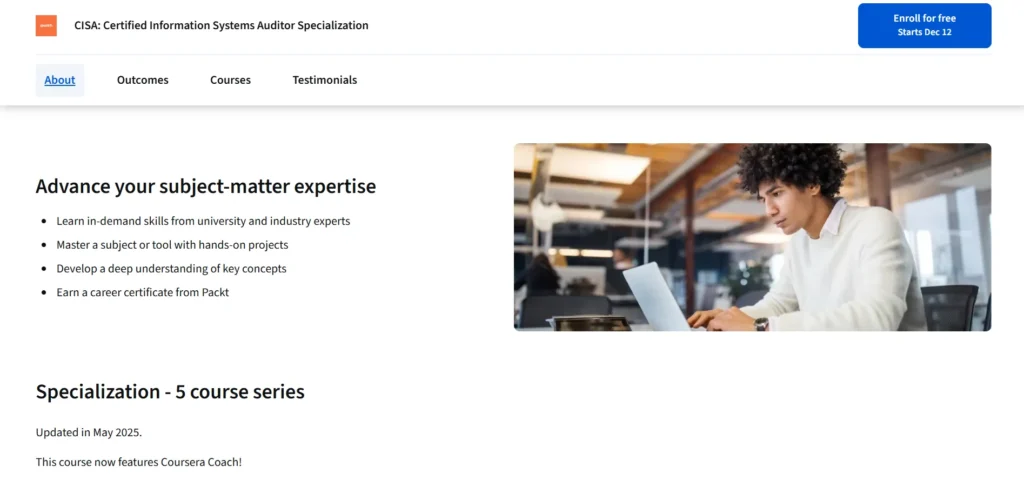 Keep in mind that while Coursera offers excellent foundational learning, you’ll still need to meet ISACA’s practical experience requirements before you can earn the official CISA certification.