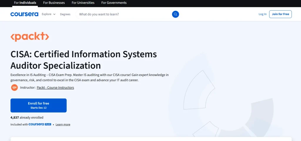 While Coursera doesn’t directly award the CISA certification, it can serve as an excellent resource to help you prepare for the exam.